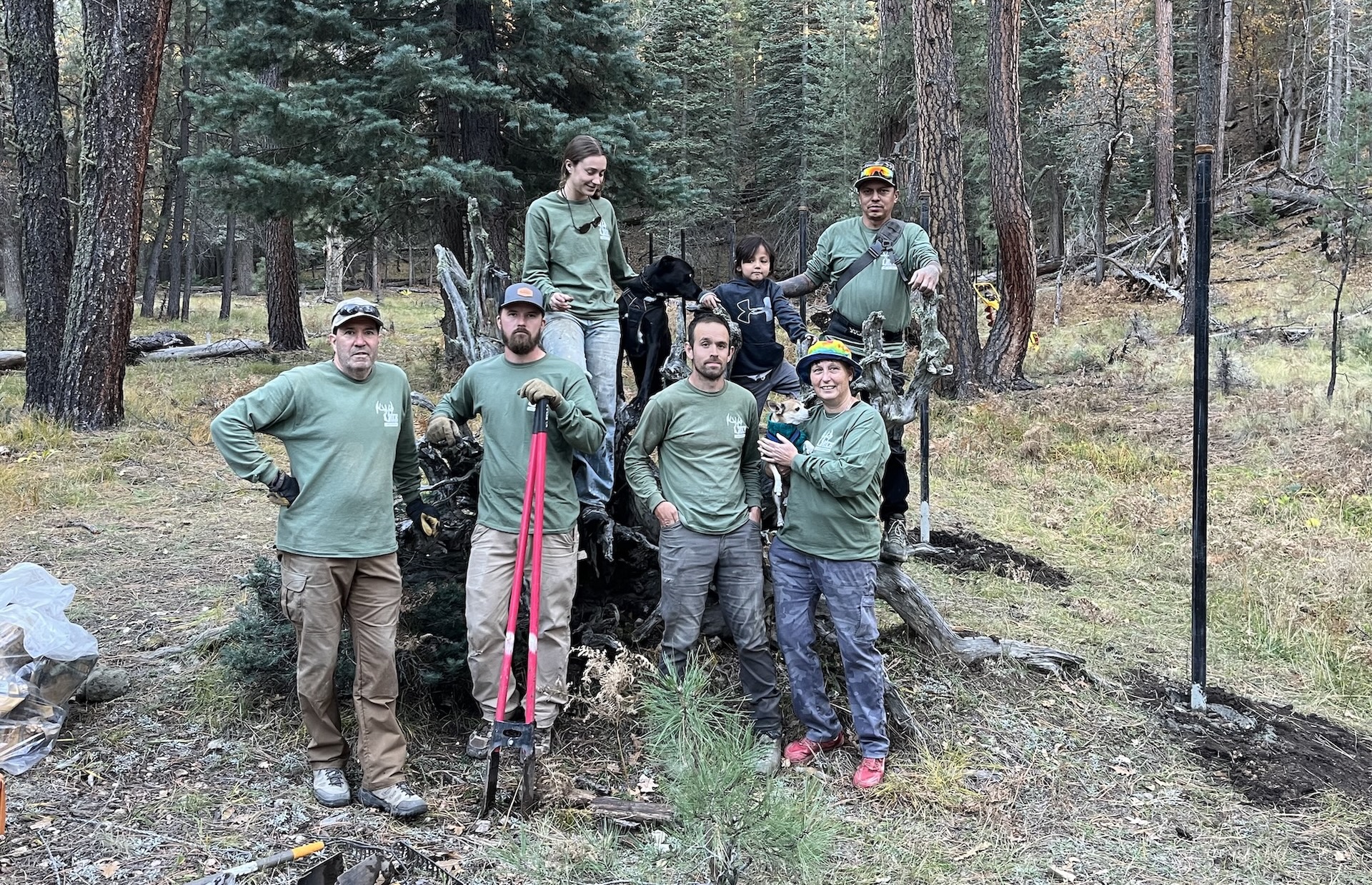 On October 24 the Arizona Elk Society headed to the forest for our last project of the season. We were heading up to Houston Draw to start a new fence and put in some erosion control structures. As we got up to our site, we set up camp quickly and headed down to the project site. Our goal for Friday was to complete the one rock dams and to get all of our corner posts set so we could run string for the rest of them on Saturday. We broke into 2 crews and went to work. When we tried to start our concrete mixer, we had rented, it wouldn’t start, so we had to mix concrete by hand in a wheelbarrow. We did finish the structures and get all of 7 of our corner posts set.